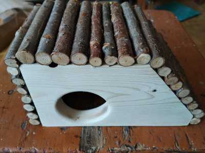 Домик для грызунов, изготовлен из вишни, сосны. Размер : длина 20см, высота 11см, ширина 10см, диаметр входа в домик 5см.